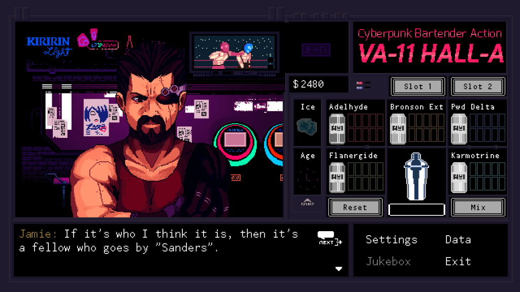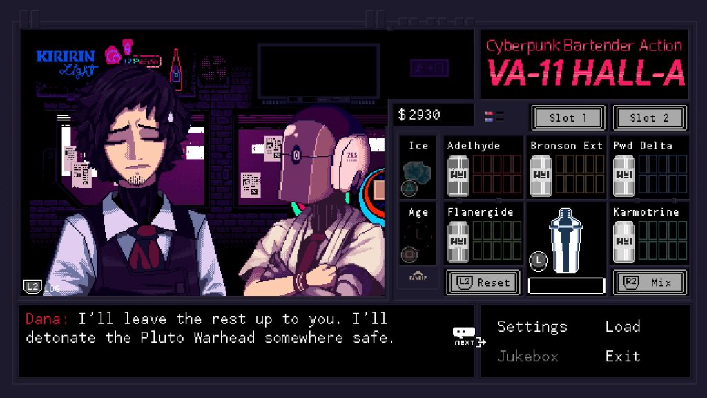 VA-11 Hall-A (referred to as “Valhalla”) is a bar that is operated by Jill, the player-character, her boss, Dana, and her coworker, Gillian. You bartend at said bar and meet a plethora of characters where everybody lives in the dystopian city of Glitch City. Nanomachines have infected everybody, corporate entities rule over all, and an admonitory police force known as White Knights make sure everybody stays in line. However the games narrative isn’t about them but rather the people who live and put up with these conditions. As you bartend your clients, they will reveal more of their life to you.